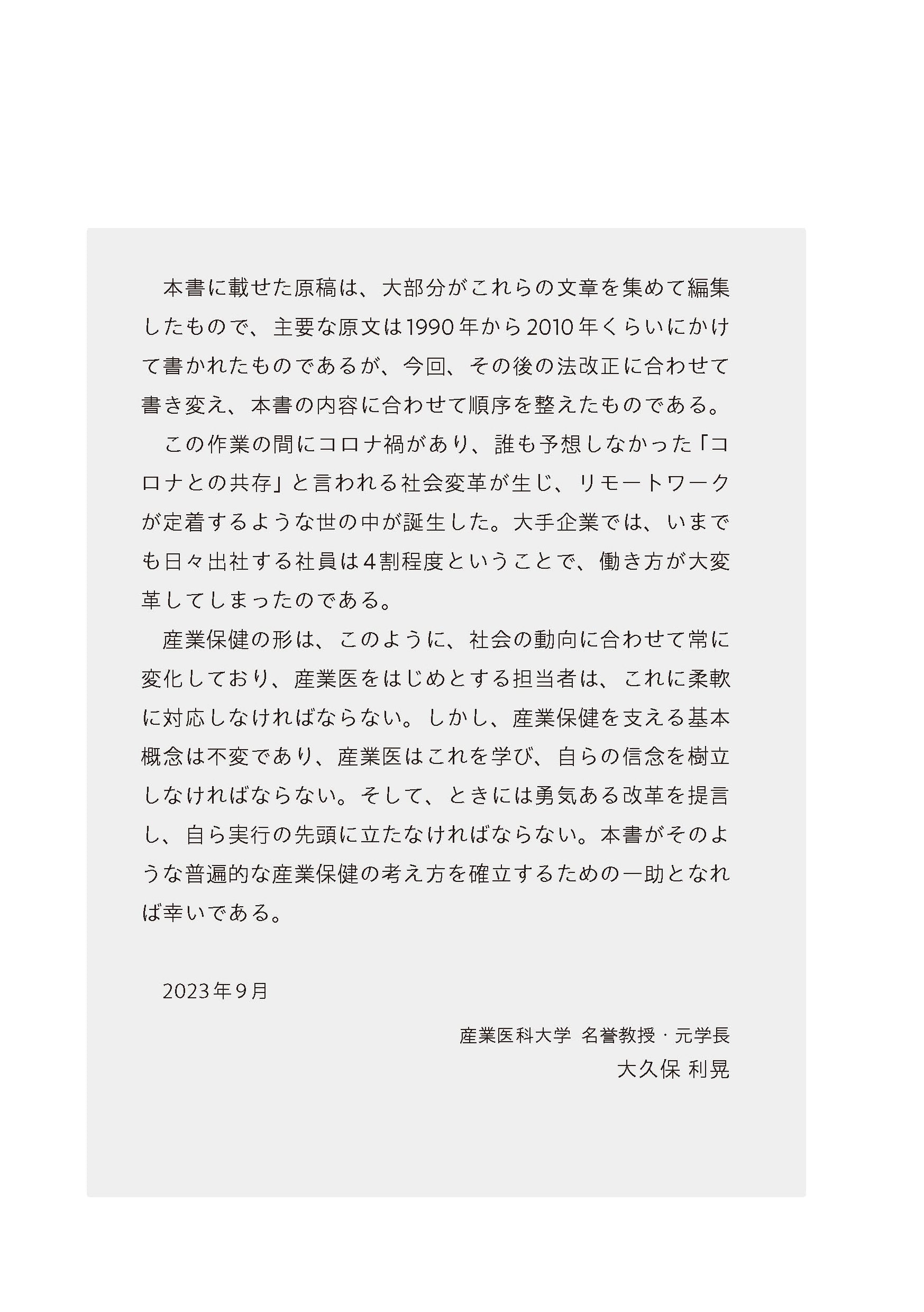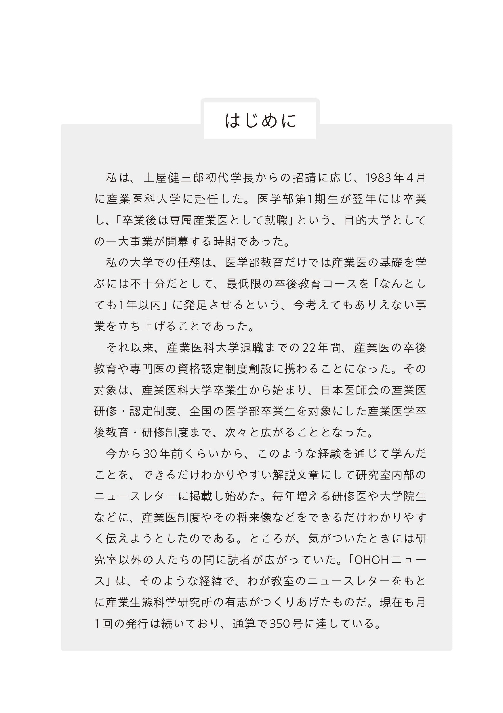 『産業医学ジャーナル』2020年43-2~2023年46-1にかけて連載され、これからの日本の産業保健を担う産業医・産業保健関係者から篤い共感を得た「産業保健の発展と産業医」の内容をベースに再構築・再編集。「産業保健の理想の地」を求めて広大な荒海へと舟を漕ぎだそうとする、勇気ある産業医・産業保健関係者に必要な能力を解説し、その志気を高める一冊。